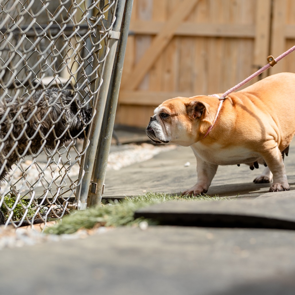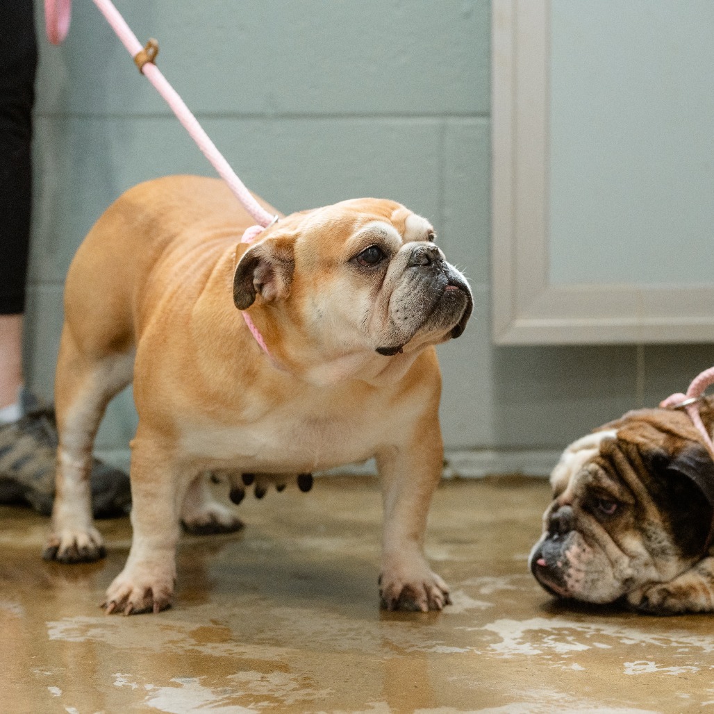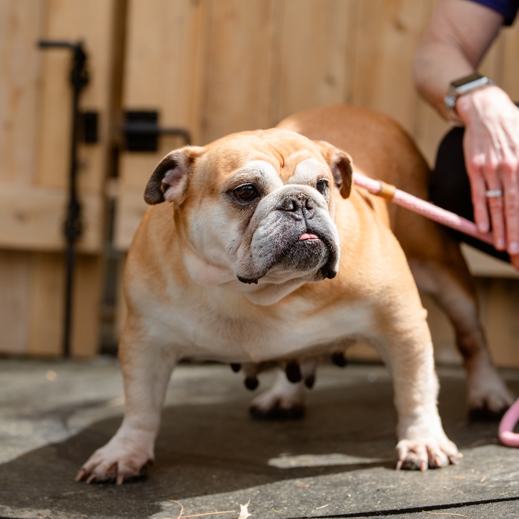 this little low-rider is a 8 1/2 year old English Bulldog. She was surrendered to us from a commercial breeder when they did not want to breed her anymore. She is 44 lbs.