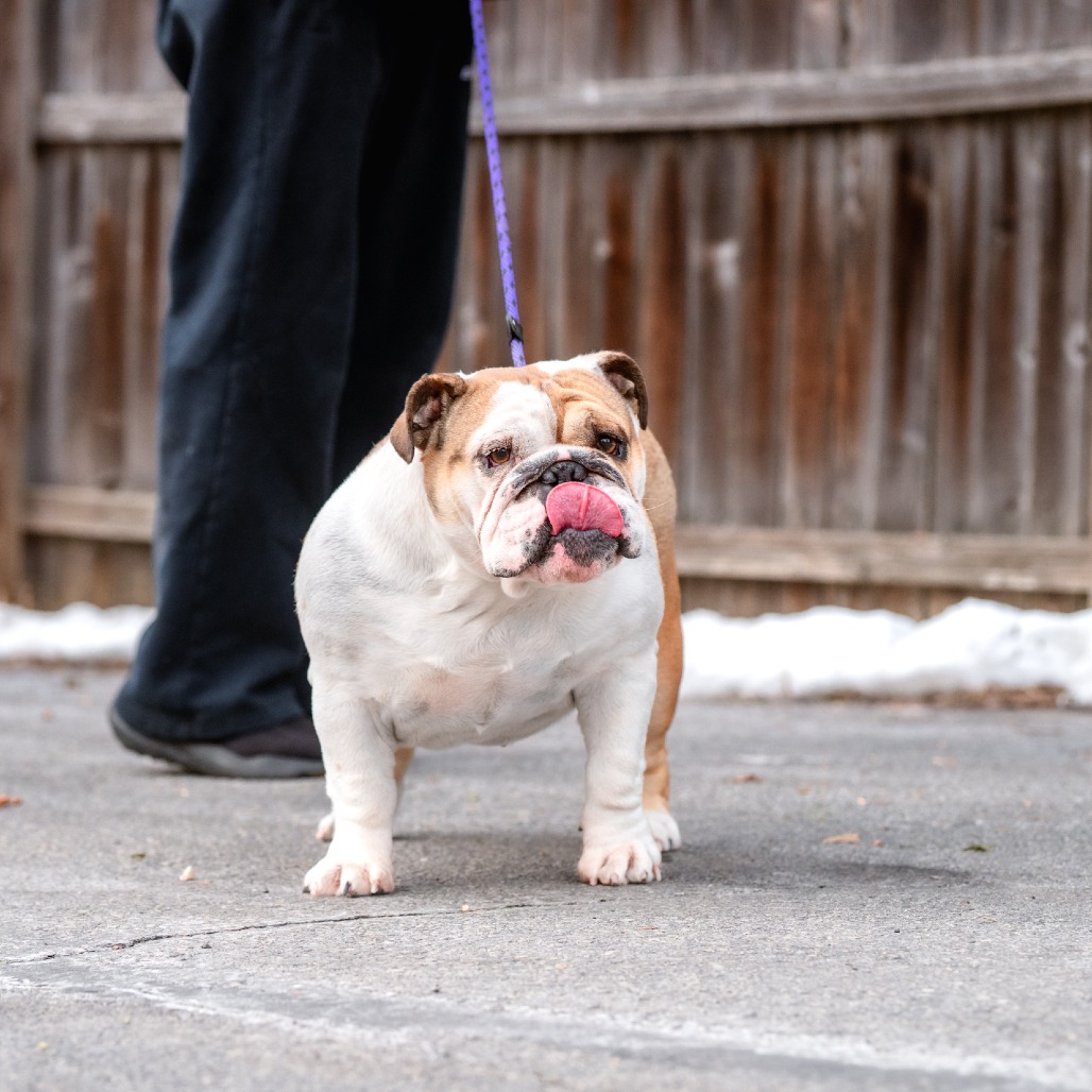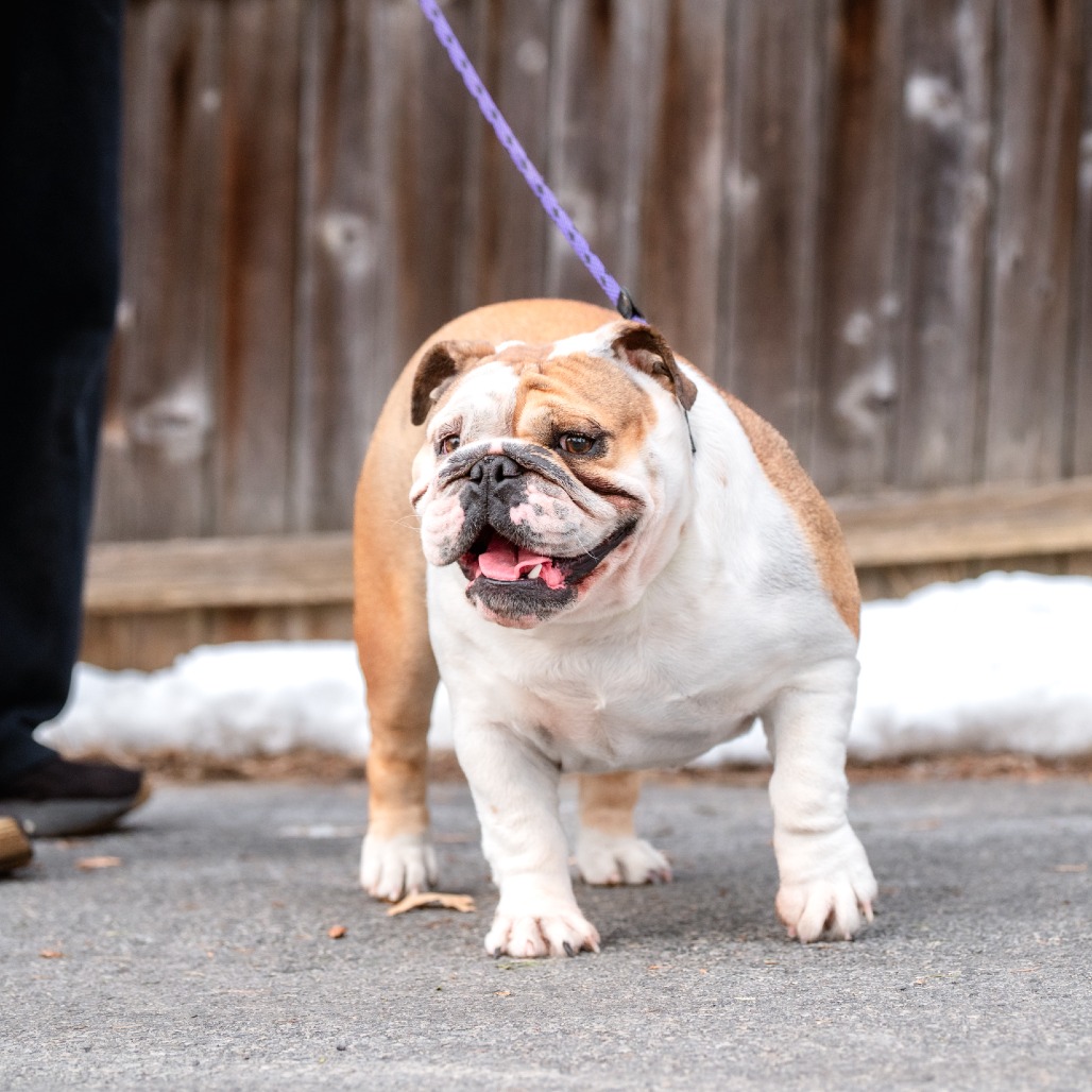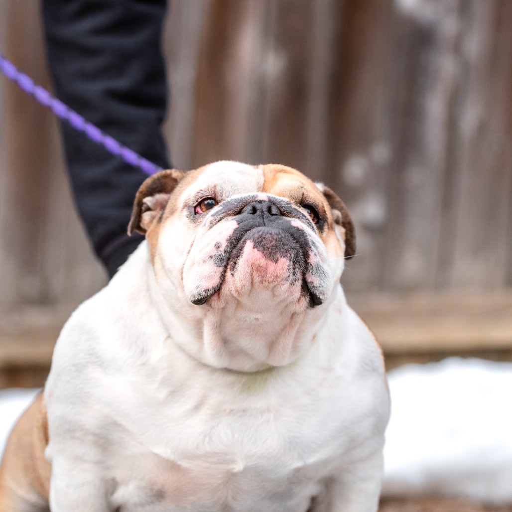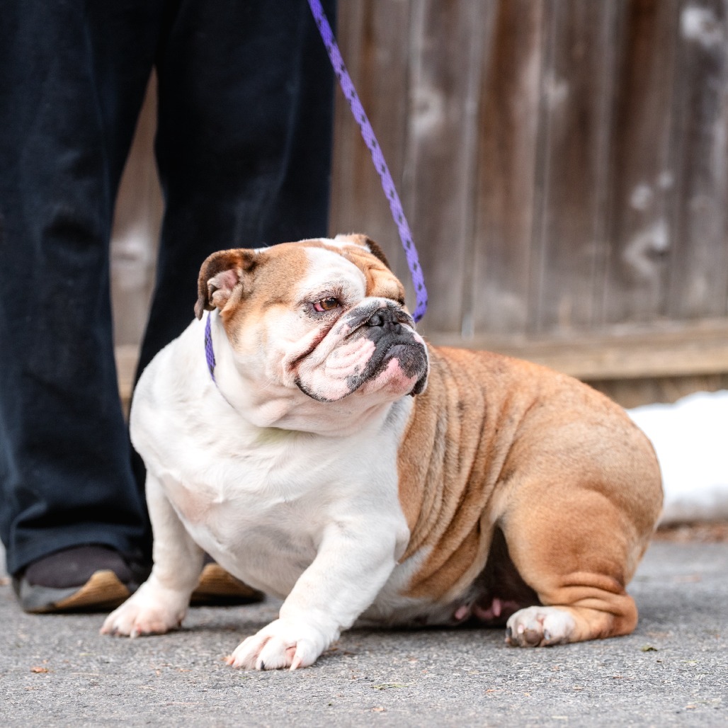 At 3 years old and 60 delightfully squishy pounds, Annabeth the English Bulldog is shaped like a warm baked potato and carries herself with the confidence of someone who knows she’s irresistible. Surrendered by a commercial breeder for not having puppies, Annabeth is now living her best retired-life — zero interest in marathons, mild interest in short strolls, and very high interest in snacks.