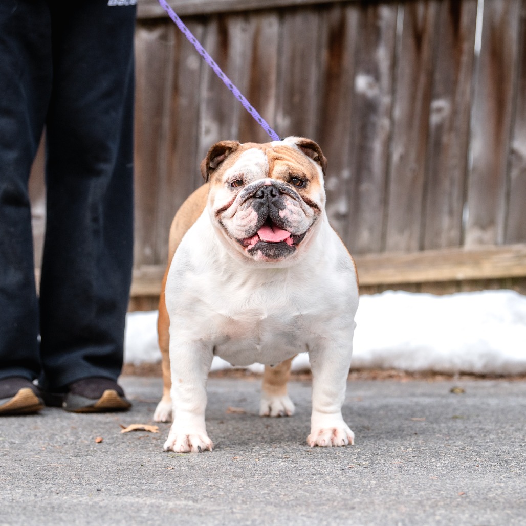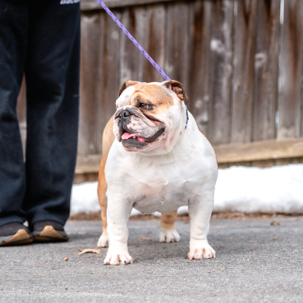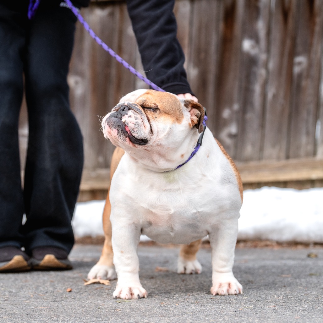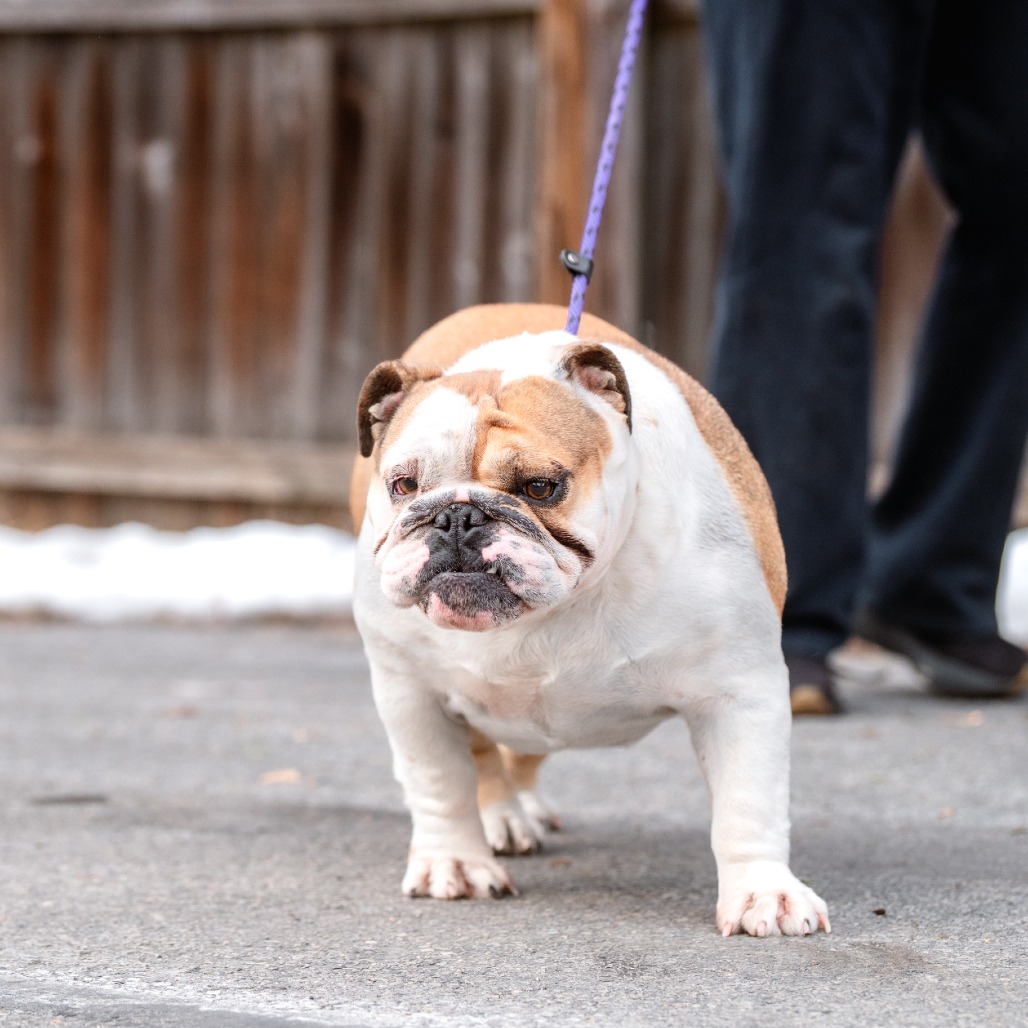 At 3 years old and 60 delightfully squishy pounds, Annabeth the English Bulldog is shaped like a warm baked potato and carries herself with the confidence of someone who knows she’s irresistible. Surrendered by a commercial breeder for not having puppies, Annabeth is now living her best retired-life — zero interest in marathons, mild interest in short strolls, and very high interest in snacks.