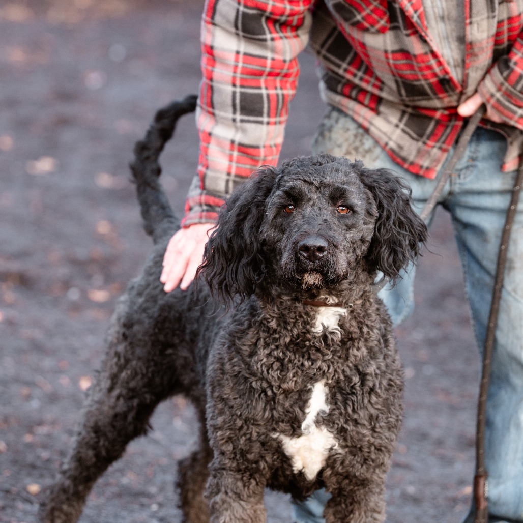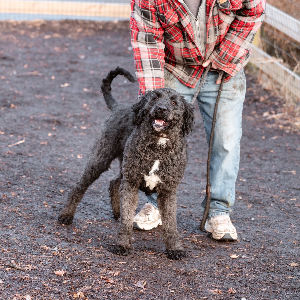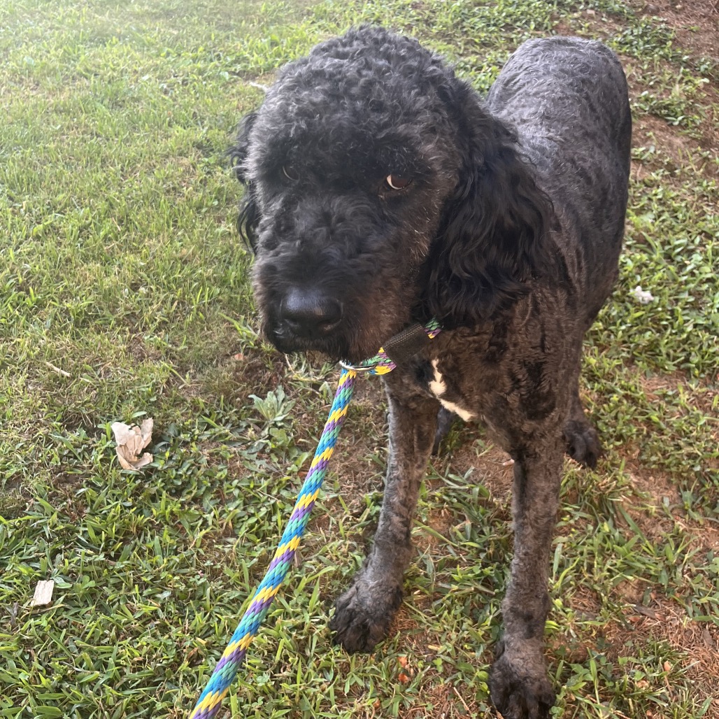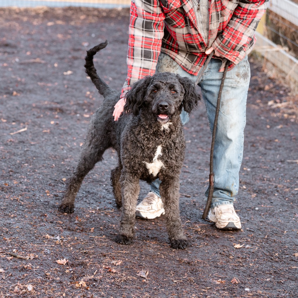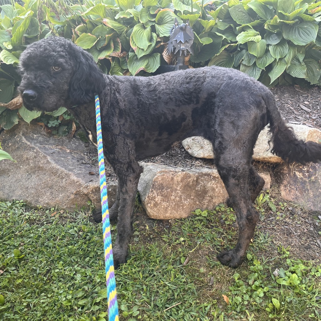 this lovely girl is an approx. 4 year old mixed breed. We suspect she is a Bouvier and Poodle mix but your guess is as good as ours. She was abandoned at a police station and brought to the local animal control shelter . She is about 60 lbs.