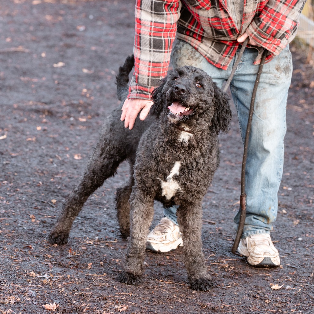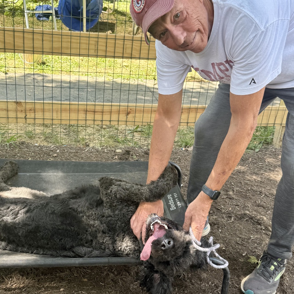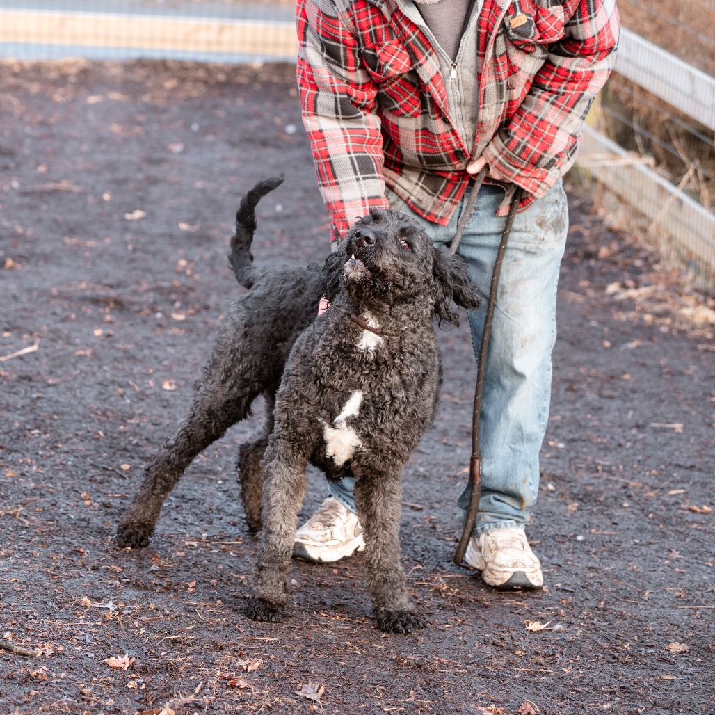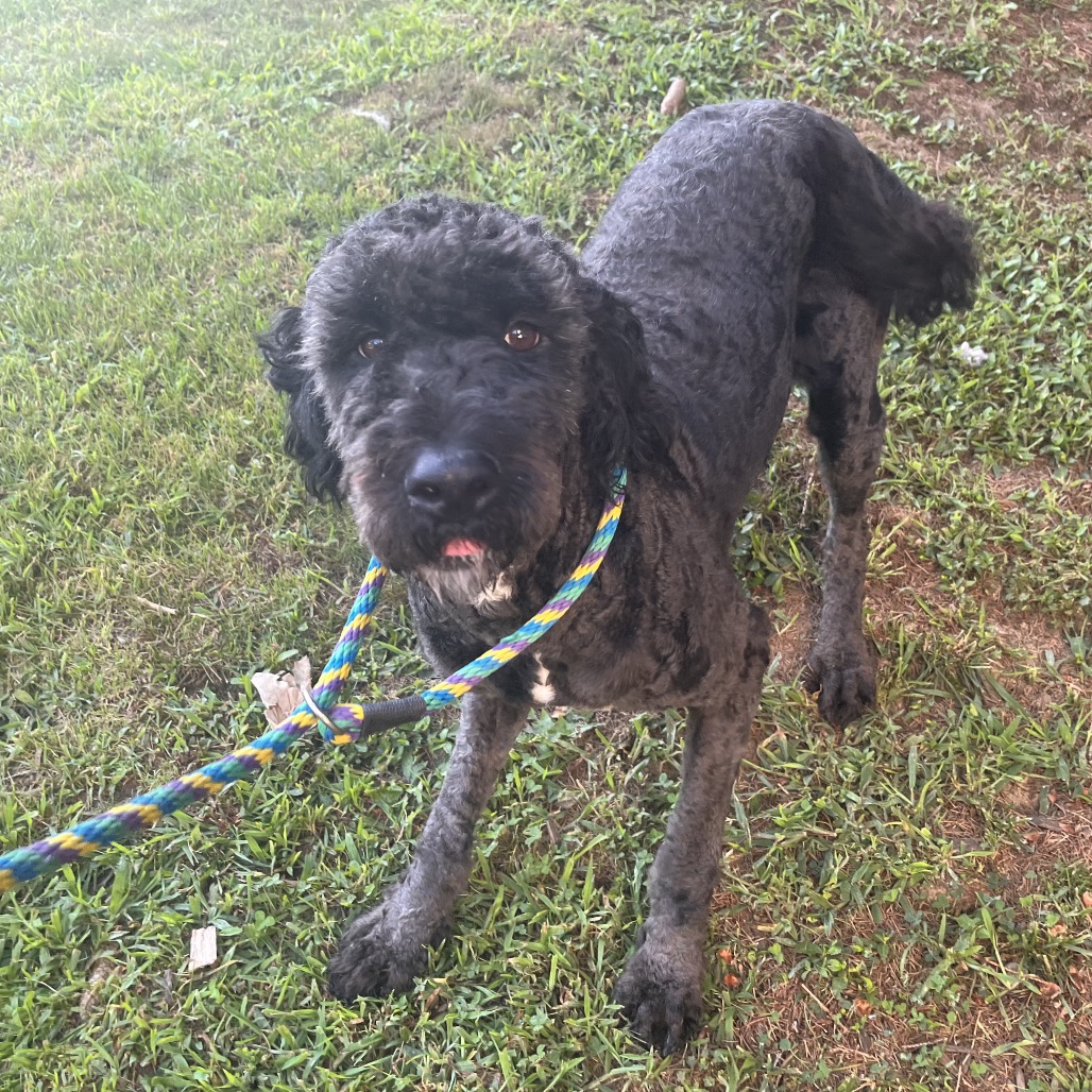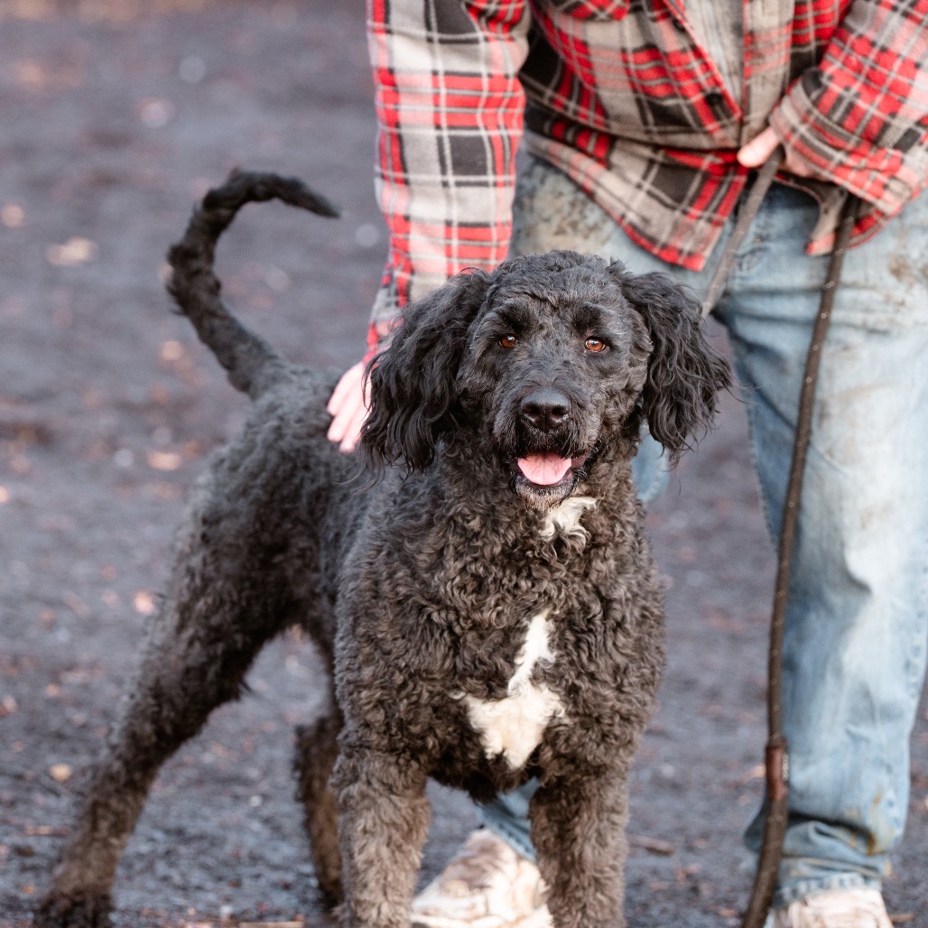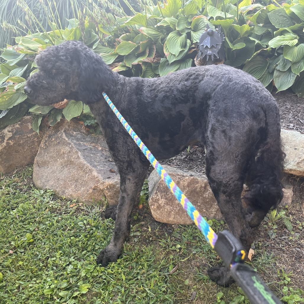 this lovely girl is an approx. 4 year old mixed breed. We suspect she is a Bouvier and Poodle mix but your guess is as good as ours. She was abandoned at a police station and brought to the local animal control shelter . She is about 60 lbs.