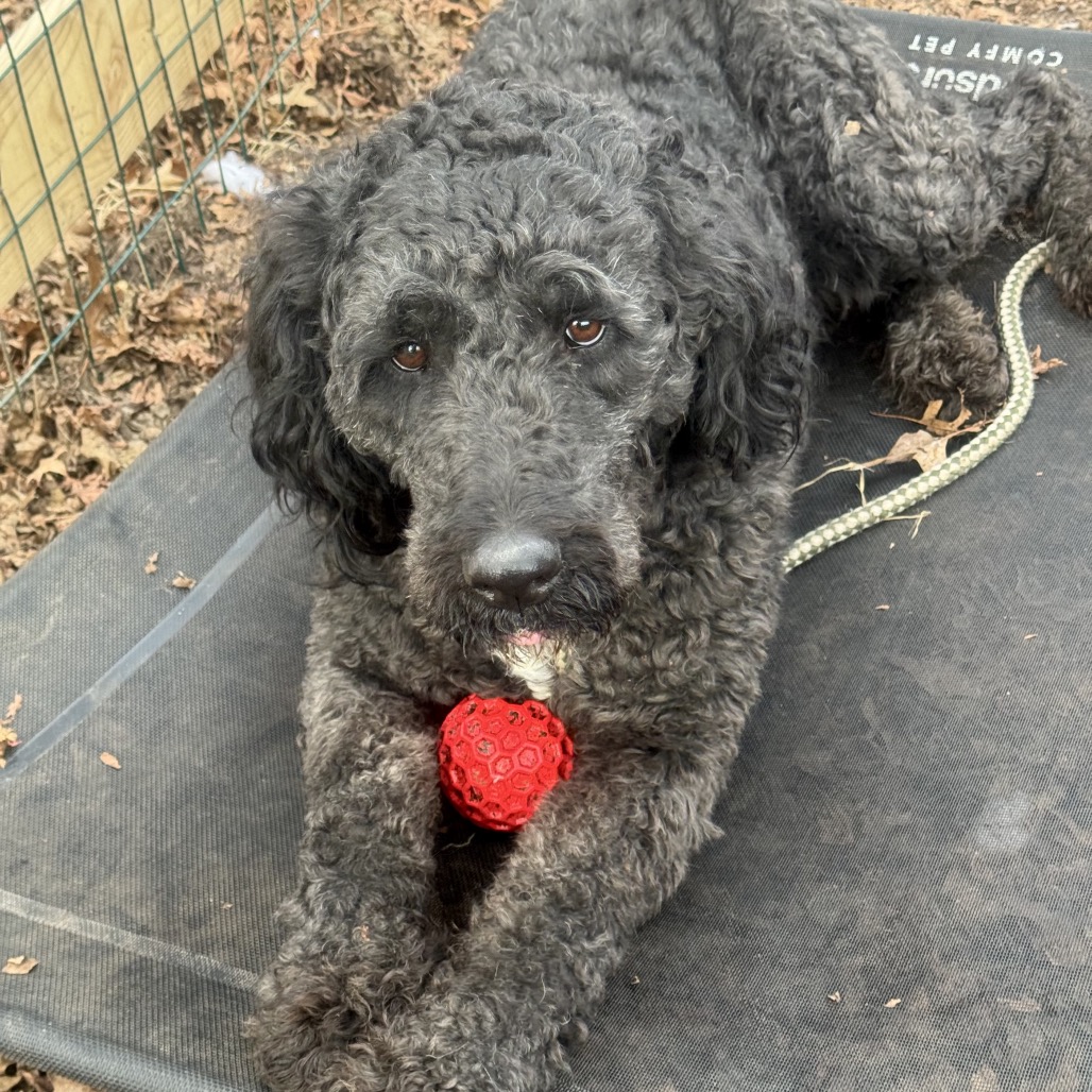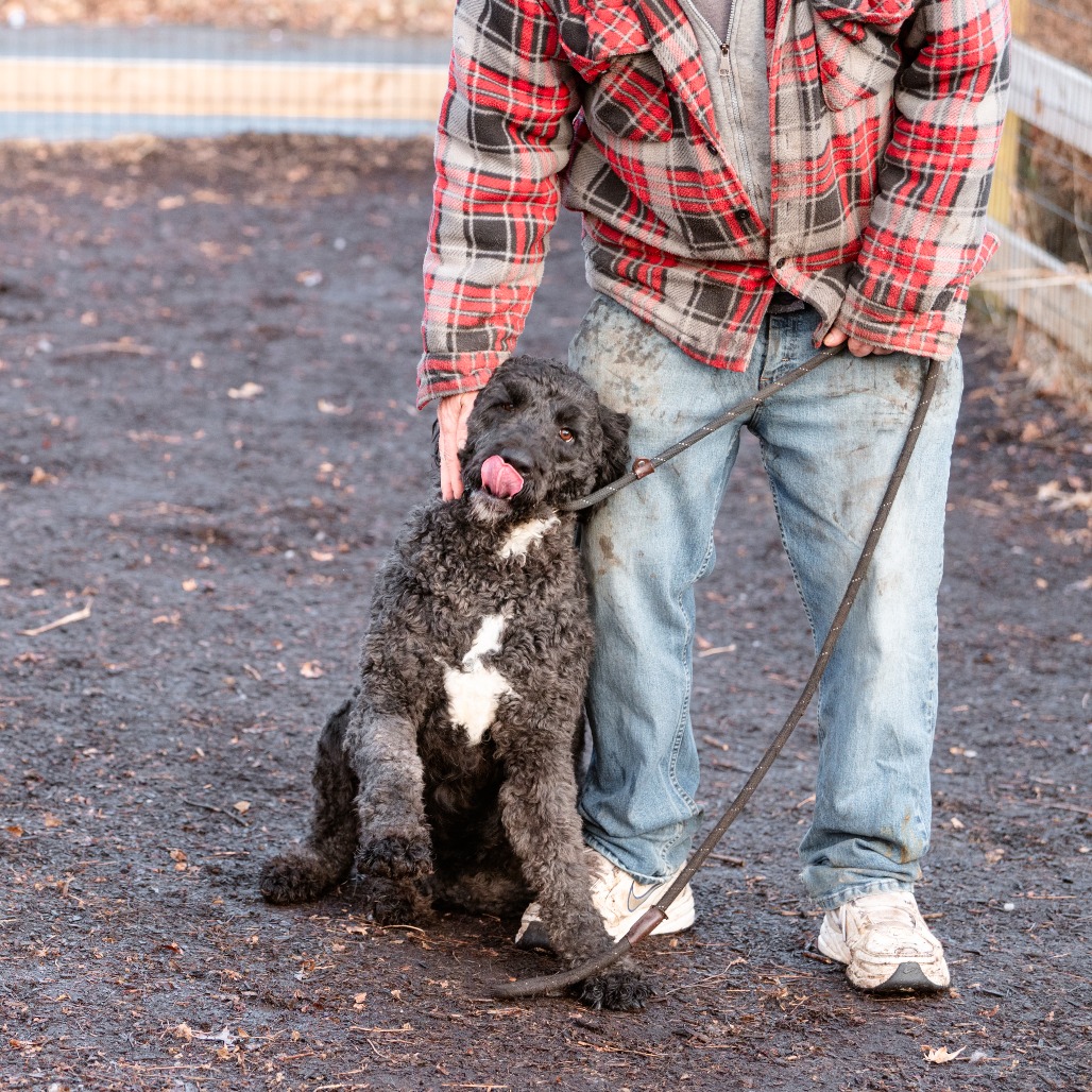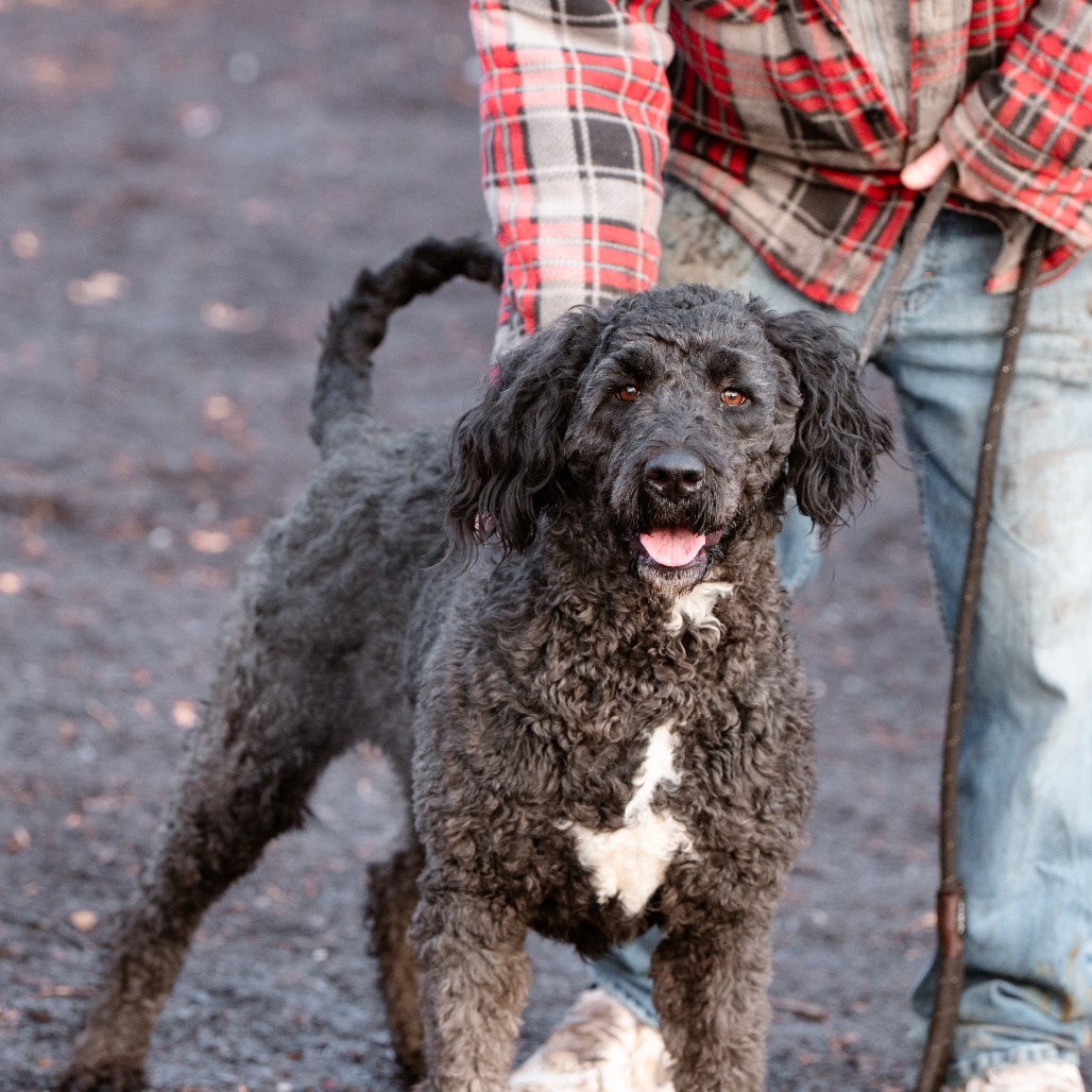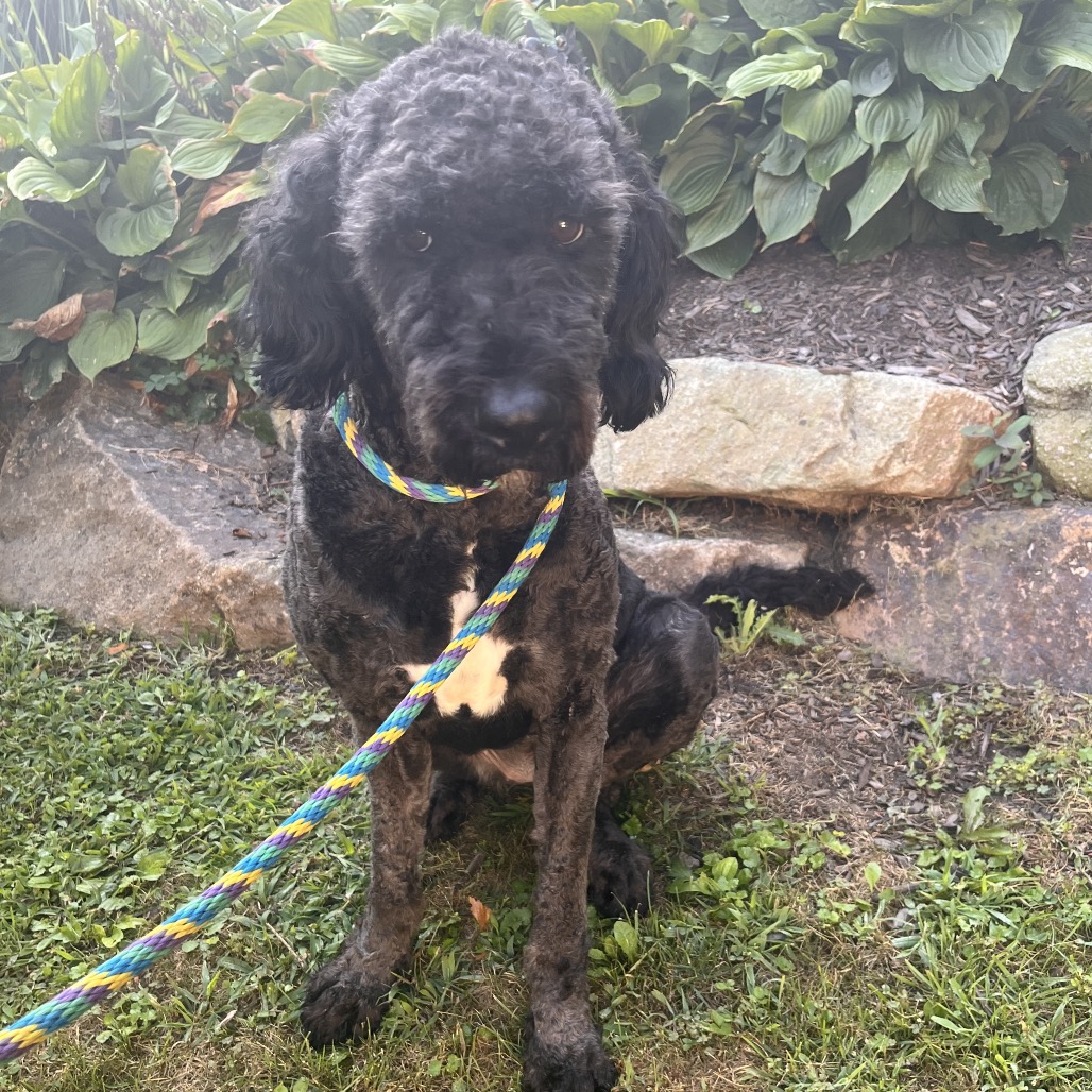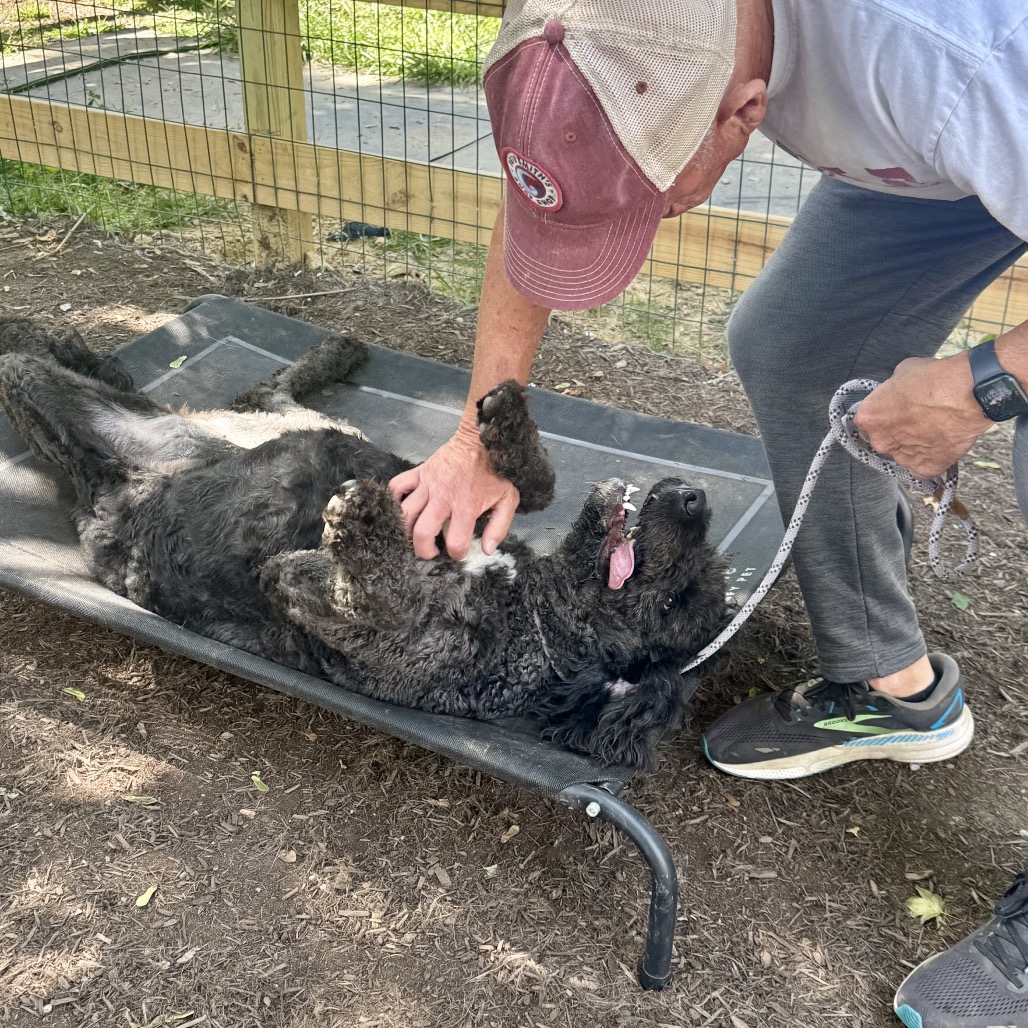this lovely girl is an approx. 4 year old mixed breed. We suspect she is a Bouvier and Poodle mix but your guess is as good as ours. She was abandoned at a police station and brought to the local animal control shelter . She is about 60 lbs.