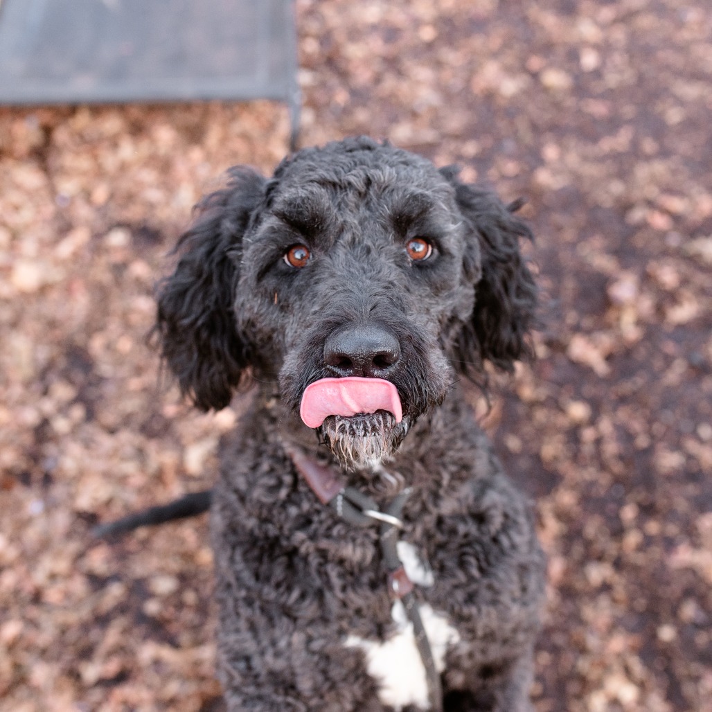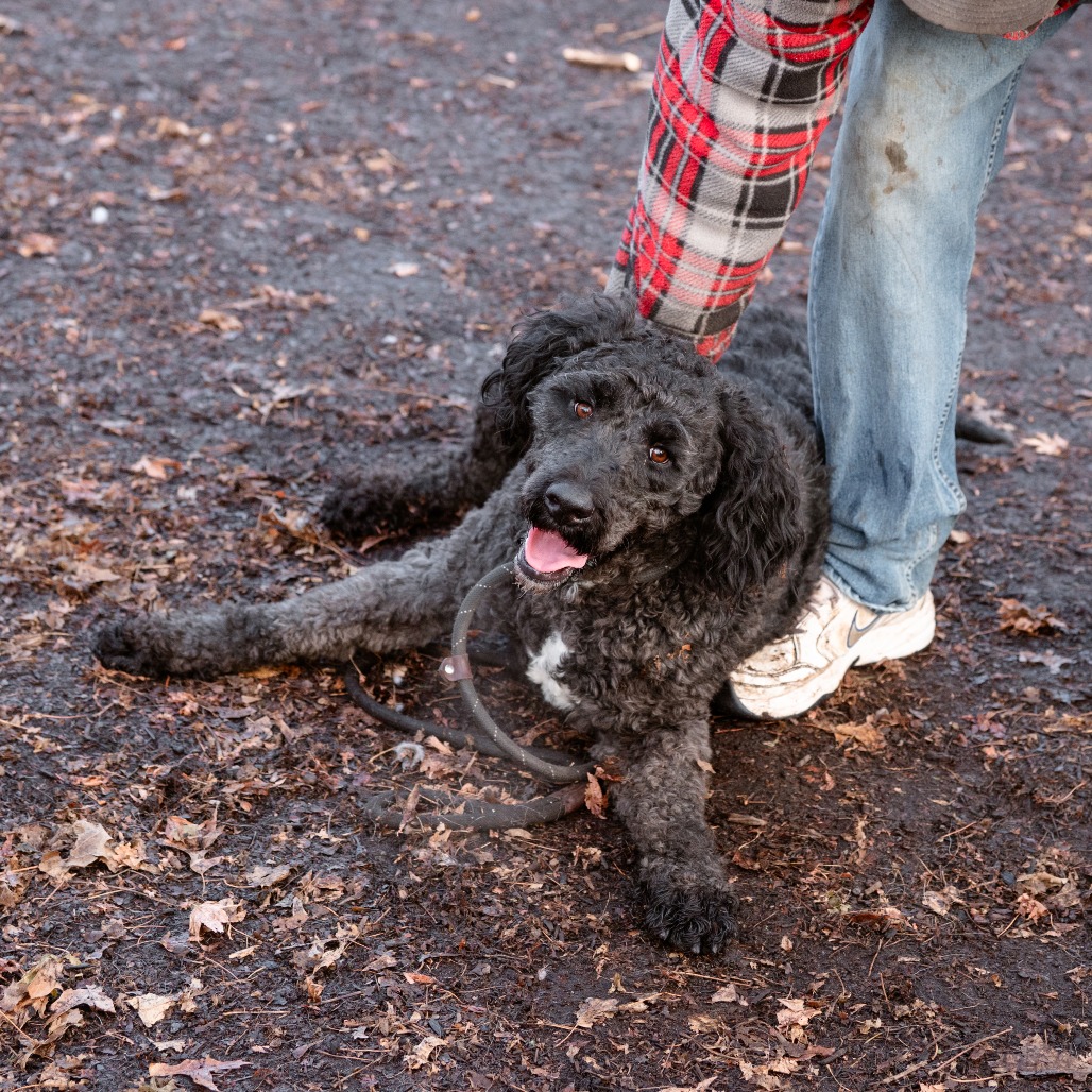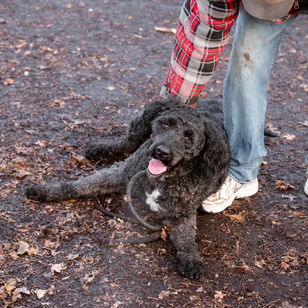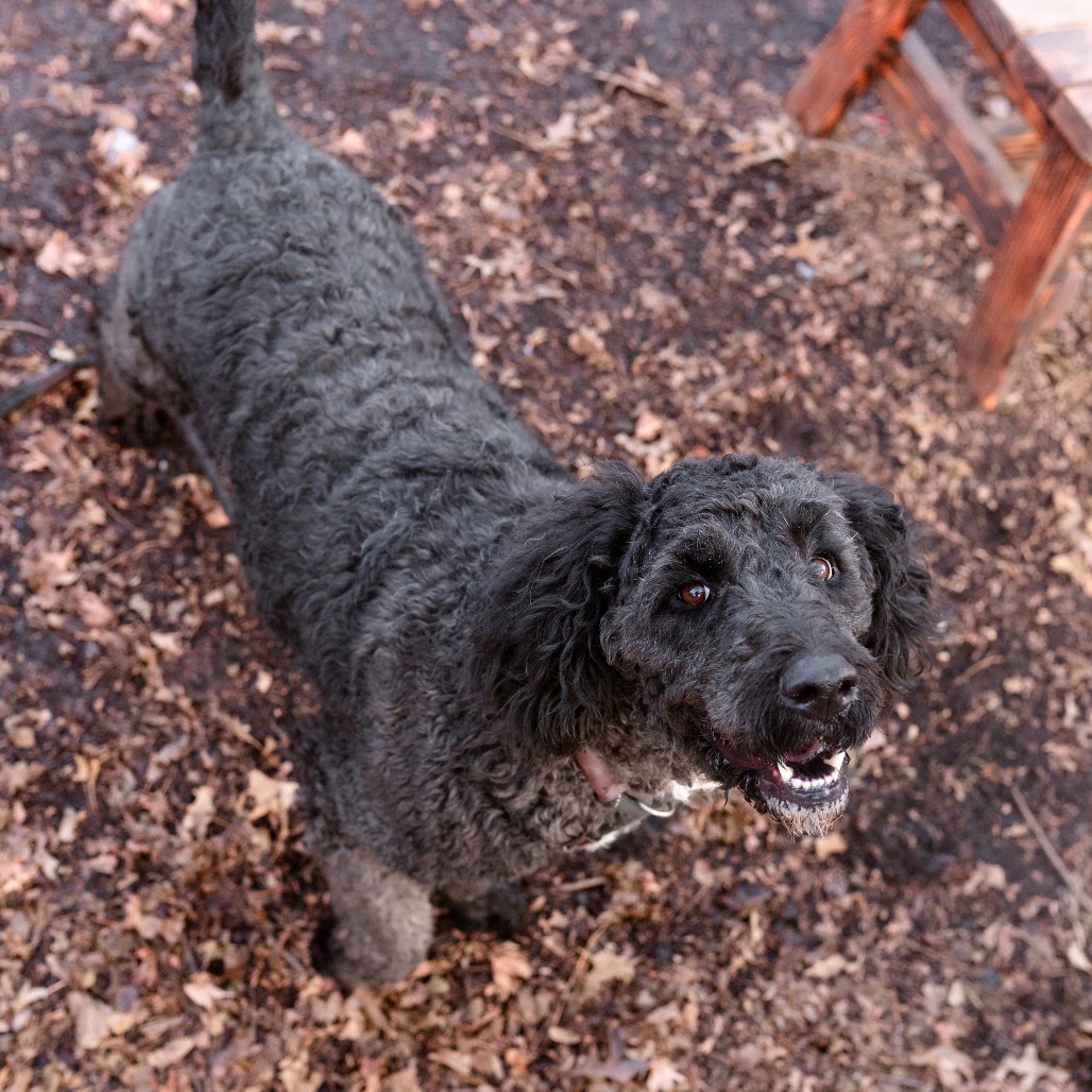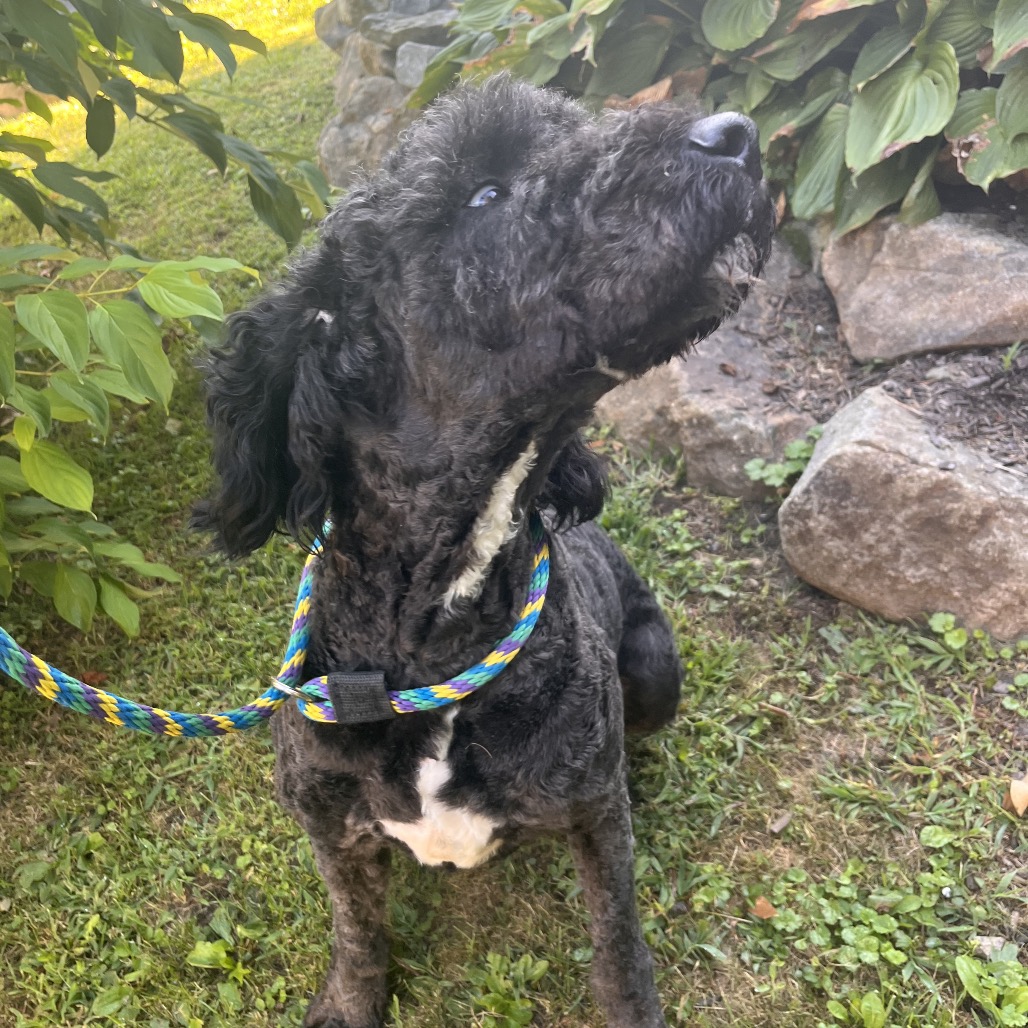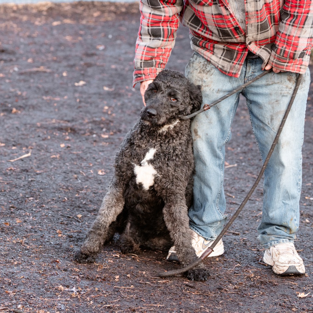 this lovely girl is an approx. 4 year old mixed breed. We suspect she is a Bouvier and Poodle mix but your guess is as good as ours. She was abandoned at a police station and brought to the local animal control shelter . She is about 60 lbs.