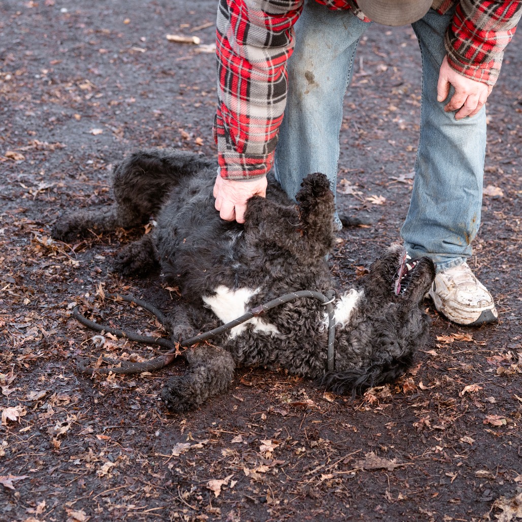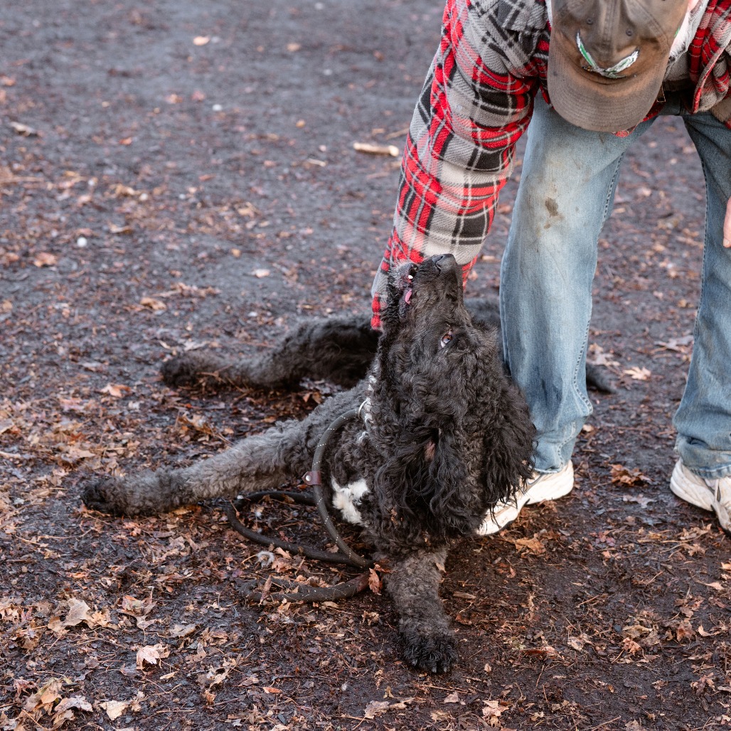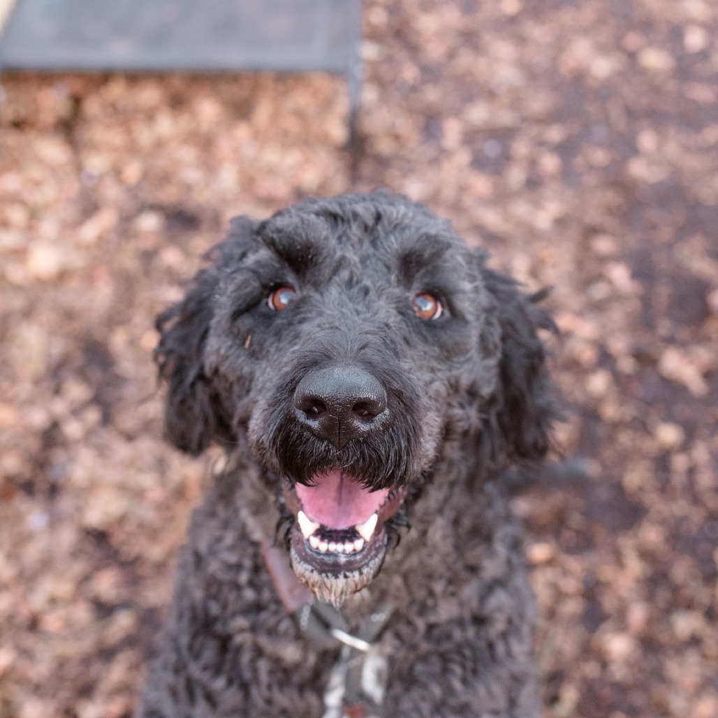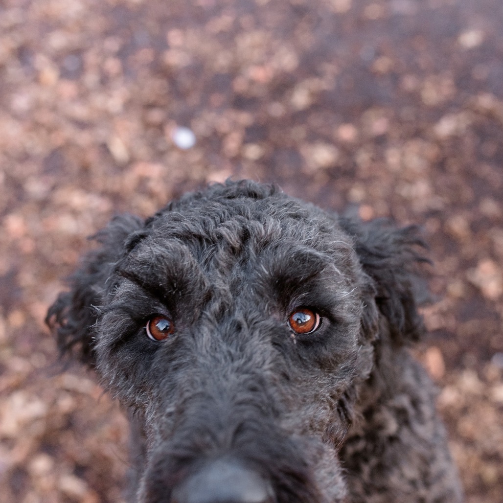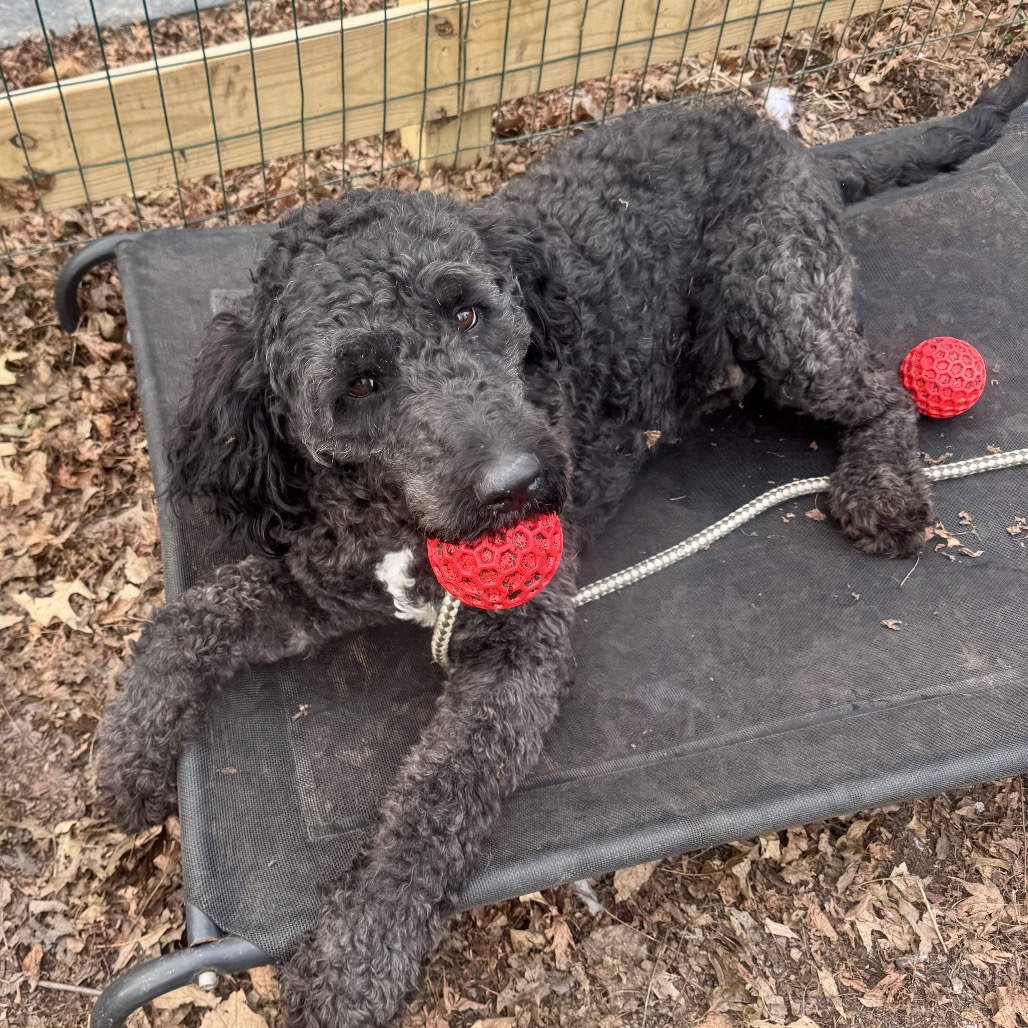 this lovely girl is an approx. 4 year old mixed breed. We suspect she is a Bouvier and Poodle mix but your guess is as good as ours. She was abandoned at a police station and brought to the local animal control shelter . She is about 60 lbs.