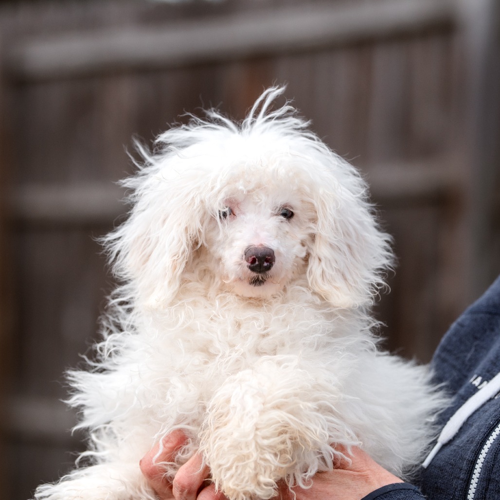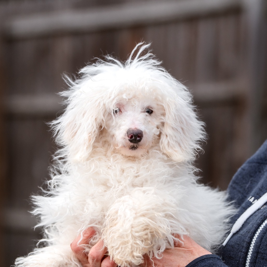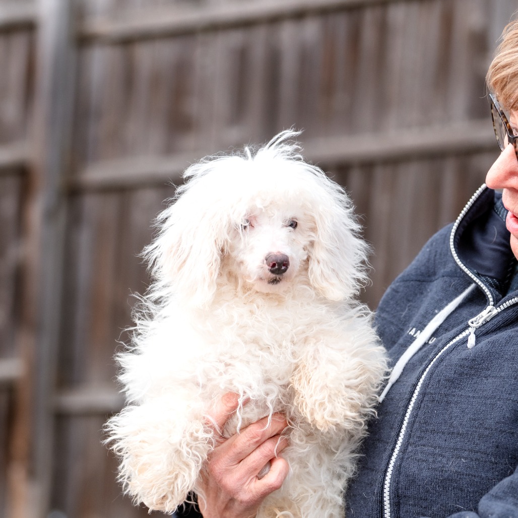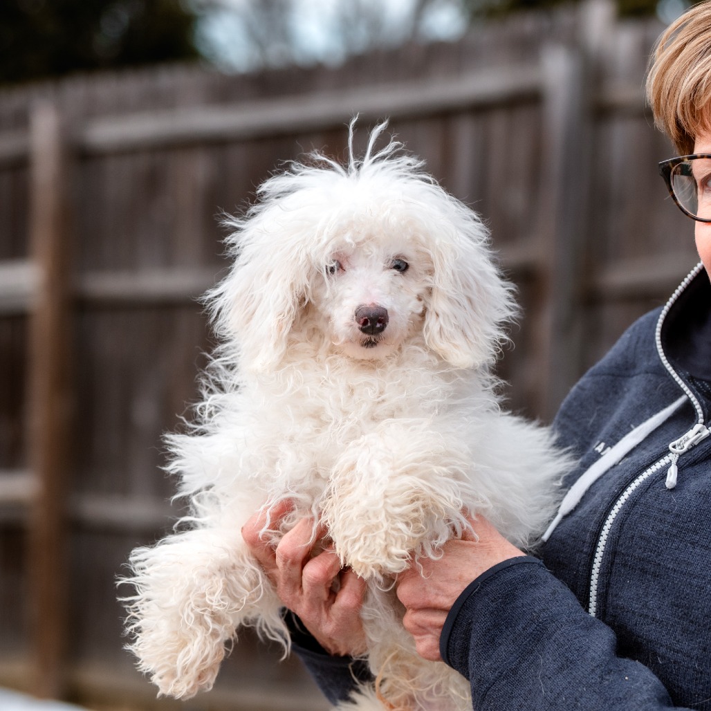 Grover is a 6 month old Toy Poodle who is a loving, curious and playful puppy who communicates primarily through body language and quickly learns visual cues. He came to us from a commercial breeder who could not sell him, as Grover is deaf.