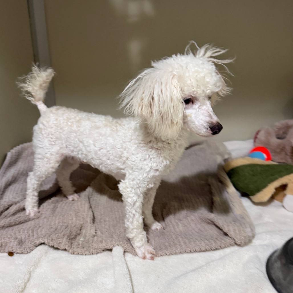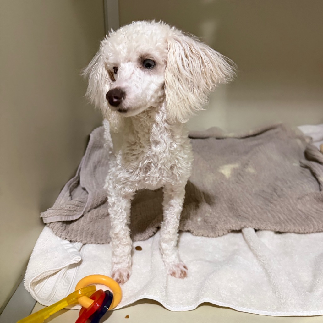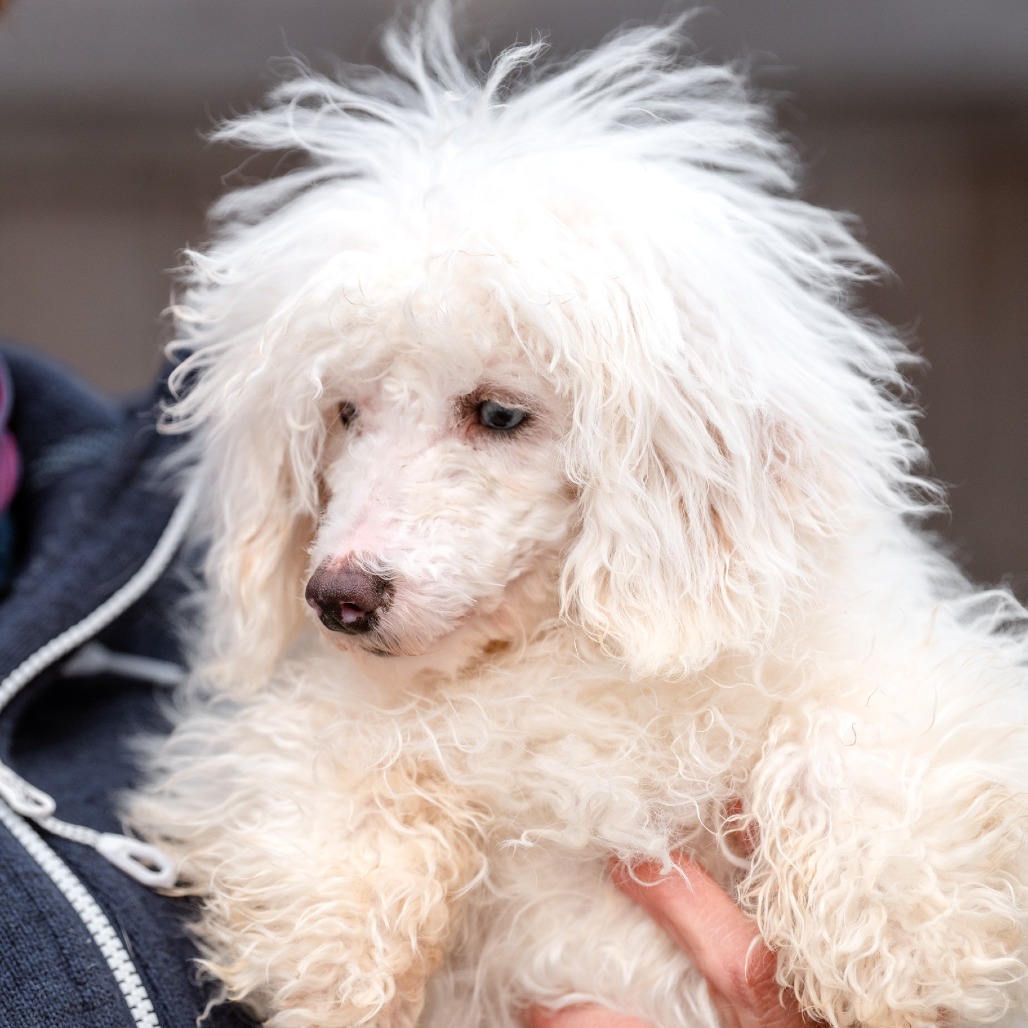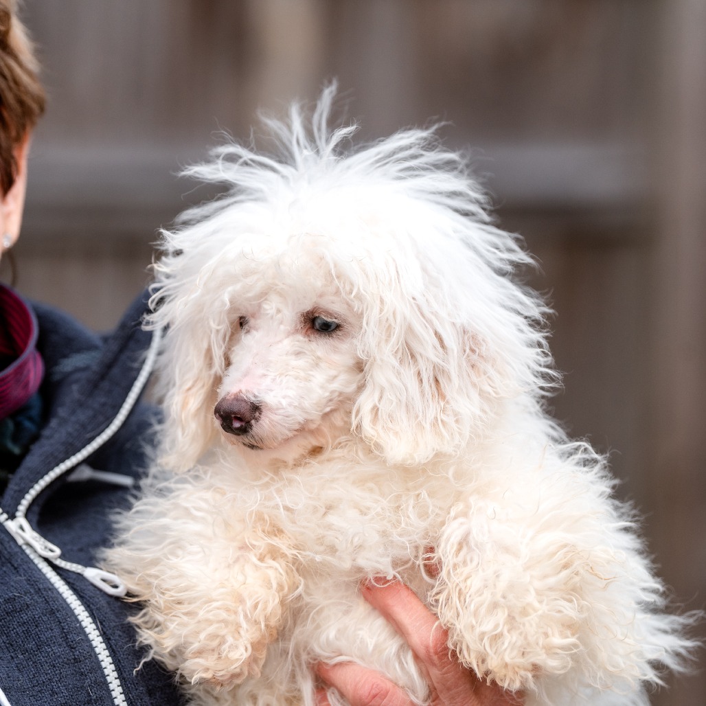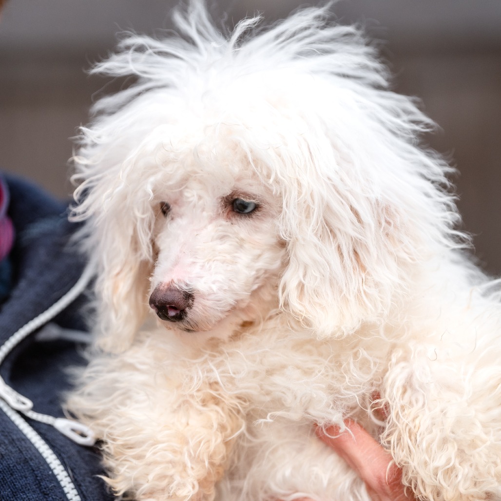 Grover is a 6 month old Toy Poodle who is a loving, curious and playful puppy who communicates primarily through body language and quickly learns visual cues. He came to us from a commercial breeder who could not sell him, as Grover is deaf.