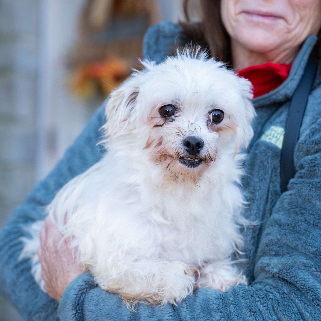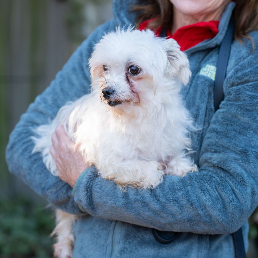 This good boy is a 9-year-old Maltese. He came to us from a commercial breeder in Lancaster with 2 other Maltese dogs when they no longer wanted to use them for breeding. He is about 8 lbs right now.