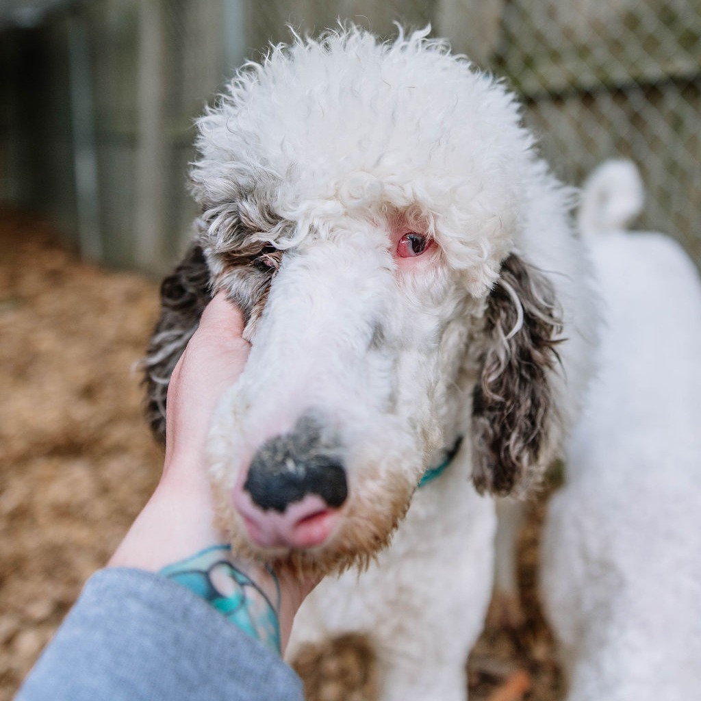 Blind and hearing impaired, Steve navigates life with courage and grace. He’s a little shy at first, but once he feels safe, his sweet personality shines through. He’s done wonderfully with grooming and handling, and he’s learning to explore the world with a sense of wonder that’s truly inspiring.